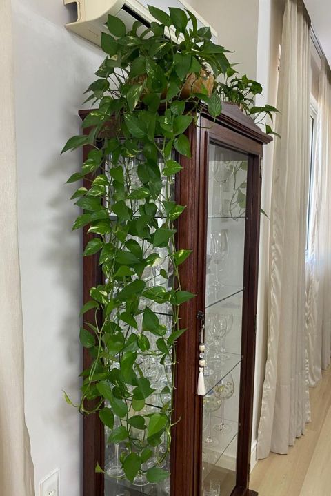 Em casa, a jiboia pode ser usada de várias formas: pendurada em vasos altos, escorrendo por prateleiras ou até conduzida por suportes e treliças. Além de linda, ela ajuda a purificar o ar e dá uma sensação de frescor e aconchego ao ambiente.
