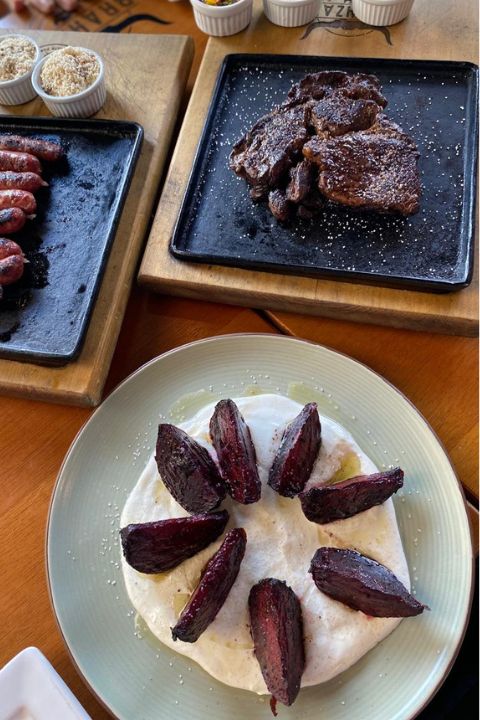 A beterraba, quando encontra o fogo da parrilla, revela uma elegância inesperada. Assada lentamente sobre as brasas, ela concentra seus açúcares naturais, ganha notas defumadas e uma textura macia por dentro, levemente tostada por fora. Cada fatia carrega o contraste entre a terra e o fogo, um sabor profundo que aquece o paladar.