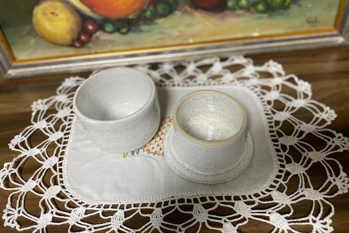O minha manteigeira francesa é artesanal, feito a mão, em cerâmica – confeccionado pela Heloisa Sabadin, ela é uma artesão criativa e cuidadosa. Observe o acabamento da peça, a cor e a textura usada.