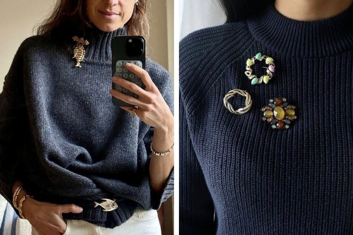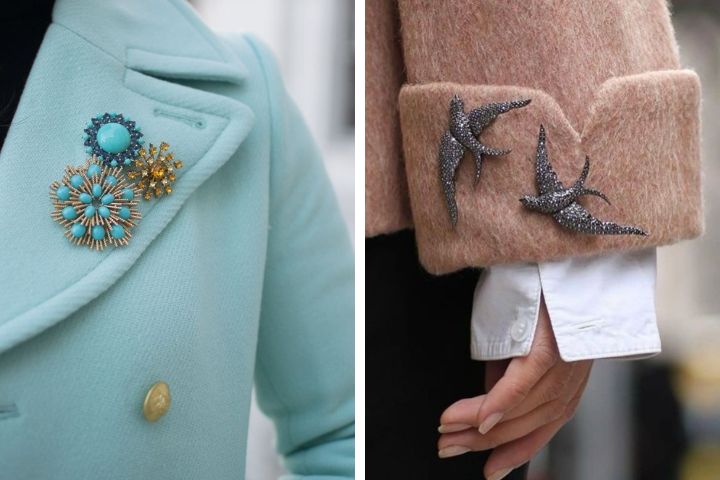 Outra proposta forte é o uso de dois ou três broches menores juntos, criando uma composição quase artística.